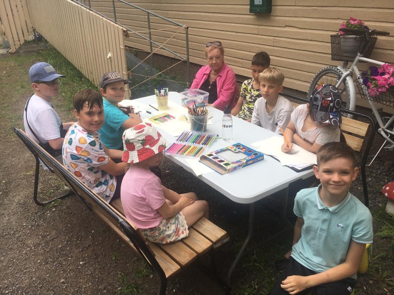 Leirillä on yhteensä 15 lasta – 12 poikaa ja 3 tyttöä.Ensimmäinen päivä oli täynnä luovia työpajoja ja vauhdikkaita ulkoleikkejä Aljanssin pihalla.